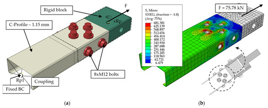 Figure 8a shows a numerical model of the joint between the test tool and the specimen. A 1.15-mm-thick C-profile was modelled using quad-dominated S4R linear shell elements, while the steel rigid block was modelled using R3D4, linear rigid shell elements. M12 bolts were modelled as C3D8R linear solid elements with a major diameter of, 12 mm and were connected to a rigid block with tie constraints. The C profile material was defined using an elastoplastic material model, which is described by the stress–strain ratio obtained from the universal tensile test that was performed. Bolt steel grade 10.9 was modelled as a bilinear elastoplastic material with yield strengths of 900 and 1100 MPa at 5% plastic strain, respectively. To represent a threaded bolt load, the pretension force must be reduced by the ratio of gross area to stress area because the bolts are modelled with the major diameter without threads. A bolt-load of 37 kN was then used to achieve preload in bolts, which represents a force of 50.5 kN in the stress area of a threaded bolt. The penalty method was used in the tangential direction between the bolt head and C-profile surface-to-surface contact. The coefficient of friction was not measured; instead, the authors in [16] used a 0.19 coefficient of friction, while hard contact was used in the normal direction. Around the holes, between the bolt and the edge of the C-profile, node to surface contact was used. When sliding occurs, the friction force between the tool and the C profile is 75.78 kN. Figure 8b illustrates the Von Misses stresses on the C profile beneath the bolt heads at the specified force, which is equal to 681.38 MPa. The shown stresses are less than the material’s yield strength. As previously stated, the test tool was designed with an obtained friction force in mind so that it could be used for other tests with C-profiles as well.
