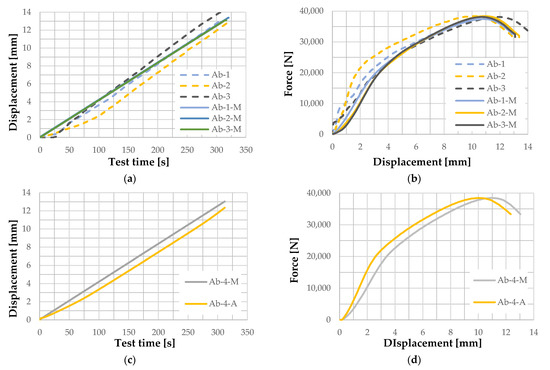 Force–displacement curves for the Ab test specimens represent the described behaviour and are shown in Figure 13. The test was stopped when a force drop of 15% was recorded on the test device. This was done for safety reasons in order to prevent sudden fracture and damage of measuring equipment. The deviations in the results for maximum force were relatively small and were about 3.6% and 1.9% for displacement.