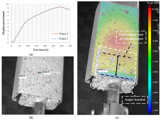 The DIC measuring technique was used to determine the relative displacements between the C profile and the angle bracket. The results were then post-processed in GOM, where two referent points were compared. Point 1 was allocated to the C profile, and Point 2 to the angle bracket. Figure 14a shows the displacement of points in time, while Figure 14b shows a relative displacement of 0.02 mm at a test time of 245 s. The relative displacements are negligible, confirming the rigidity of the connection between the C-profile and the angle bracket. In addition, due to the very rigid connection of the clinch-pressed connectors, the C-profile follows the deformation of the angle, which is also shown as a displacement field in Figure 14c. Analysing the field reveals that the lever arm, z, is formed between the edge of the web of the C-profile and the outermost row of connectors, which helps to limit the angle bracket’s rotation.