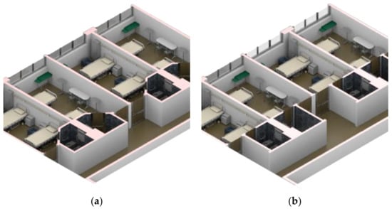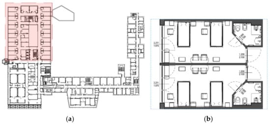 The wards are organized according to a five-fold structure, characterized by a twin-aisle spatial layout; the services are located in the central area and the rooms on the windowed sides of the building (Figure 1a). The maternity ward is equipped with two-bed coupled rooms, which follow the same module; each room (floor area and volume 23 m2 and 68 m3, respectively) has its own toilet directly accessible from the room (Figure 1b) and overlooks the internal corridors that connect the ward to the hall distribution system. The distribution system does not provide for a filtering space between the rooms and the corridor; in fact, as it is usual in a hospital ward, the patient rooms are in close contact with all the flows of people and correlated activities that reach the ward daily, without any filters able to “isolate” the in-patient from the routine activities of the health services.