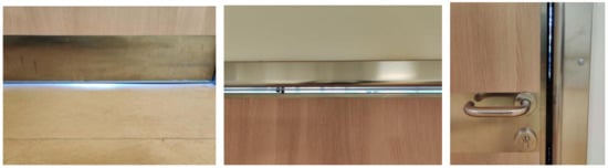 The door, in Figure 2 and Figure 3, between the room and the corridor, is a roto-translating door with no bottom rebate; for this reason, this is the weak element in terms of sound transmission. Figure 2 shows details of the junctions between the door and the lateral wall and between the door and the flooring. Large gaps are evident on both joints.