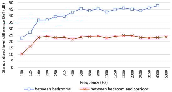 Results of the standardized level difference, DnT, between the two bedrooms and between the corridor and the bedroom, with the doors closed, are shown in the frequency range 100–5000 Hz in Figure 5.