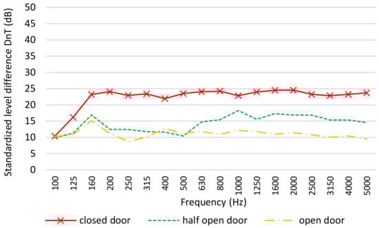 Figure 6 shows the standardized level difference between the room and the corridor in the frequency range 100–5000 Hz in the configuration with the door closed, half-open, and completely open.