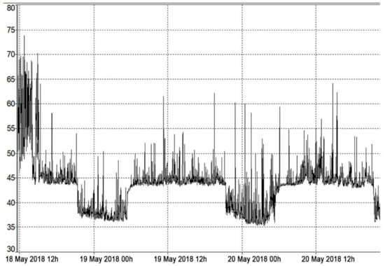 The second analysis carried out to study the noise immission in an unoccupied bedroom consisted of the continuous measurement of the sound levels for two days and nights, as shown in Figure 7.