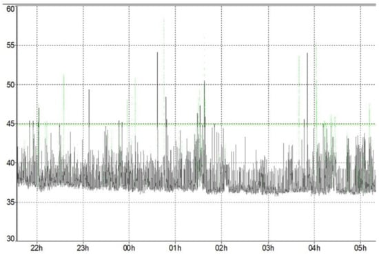 The time history of the complete measurement (with recording sampling every 2 s) was analyzed, highlighting the peaks with a sound level capable of causing sleep deprivation in the patient.