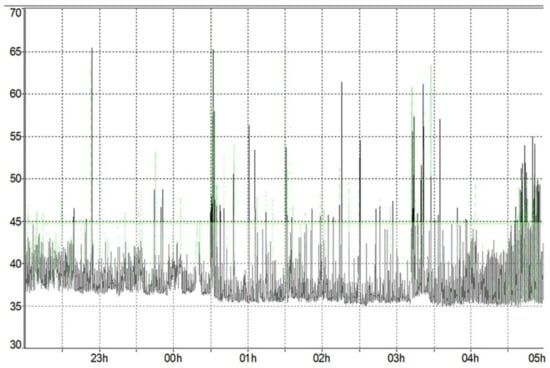 Time history of the second night (in green, the threshold exceedances set to LAeq = 45 dB(A)).