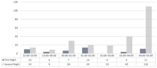 The number of total events with LAeq > 45 dB(A) during the first night is 50 while the second night period is characterized by a much larger number of events, 191, quadrupling those recorded the previous night, as shown in Figure 10.