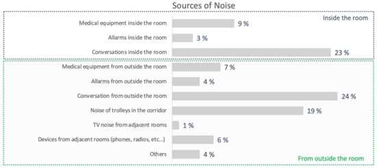 Noise pollution is considered one of the most disturbing factors within hospital environments [,]. For healthcare staff, for example, prolonged exposure to noise can alter stress levels, reduce work performance [,] and increase burnout rates [].