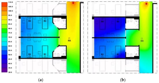 Results of simulations of sound propagation generated by a source in the corridor: on the left, in the original configuration (a) and on the right, in the modified configuration (b). Adapted with permission from Ref [].