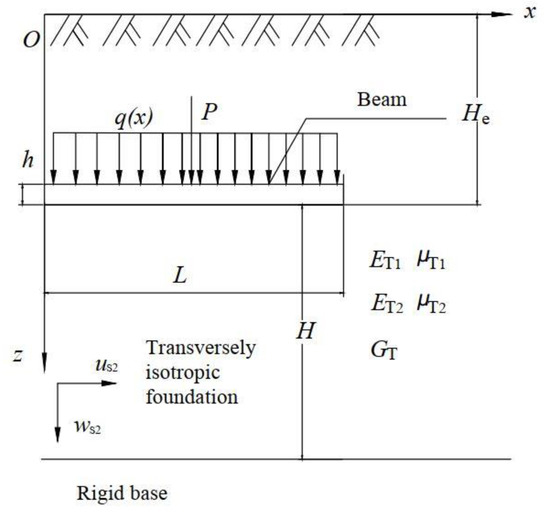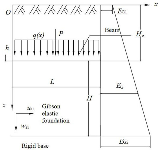 The beam structure utilized in the present study is embedded in elastic soil layers over a rigid base. The complex structural phenomena of the actual soils significantly affect the strength and stability of soils and the mechanical states of the foundation–structure system. The assumption of isotropy and homogeneity cannot reflect the real states of foundation soils. Considering the non-homogeneity of soils, the mechanism problems such as force transfer and foundation stability can be more accurately studied. As shown in Figure 1 and Figure 2, a finite-length beam is embedded in two novel Vlasov foundations whose concept is widely encountered in engineering practice. The length of the beam structure is , the height is , and the embedment depth is . The width of the beam is assumed to be equal to 1 m, and the distance from the lower surface of the structure to the rigid base layer is . The foundations are regarded as Gibson elastic soil and transversely isotropic elastic soil, respectively. It is generally assumed that the friction between the beams and foundation soils can be ignored. The uniformly distributed load acting on the elastic beam is , and the concentrated load on the beam in the midspan is .