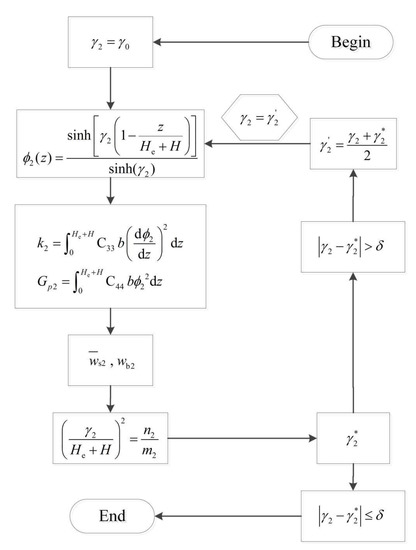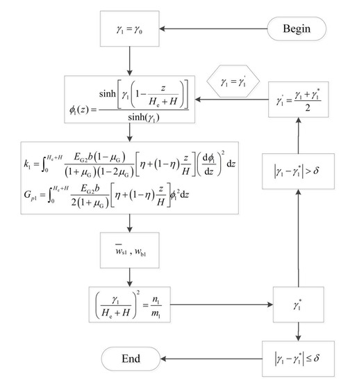 In the above formulas, the model coefficients (, ) and attenuation functions are related to the attenuation parameter . Therefore, the iterative technique can be used to deal with this problem. The convergence rate of this process is fast, and the exact solution to the results can be derived. Figure 3 and Figure 4 show the iterative flowchart of the attenuation parameter in a Gibson elastic foundation and the iterative flowchart of the attenuation parameter in a transversely isotropic foundation, respectively [31,32,33,34,35,36,37]. Iteration is continued until the two values of are approximately equal. That is, and .