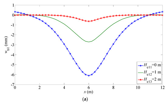 Firstly, the two modified Vlasov foundations still use two independent coefficients (, ) to describe the compressive and shear properties of the physical models. If the soil of the two refined Vlasov foundations is assumed to be an isotropic and homogeneous medium, and the embedment depth effect is not considered (), the results in the present study will degenerate to the case of the beam structure resting on a traditional Vlasov elastic foundation. Compared with equations for the traditional Vlasov model, the equations for the modified Vlasov foundations are not different in form. However, the relevant model coefficients will change, and this change mainly depends on the constitutive relation of the soil medium.