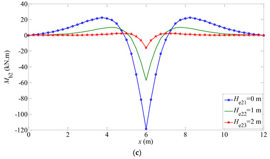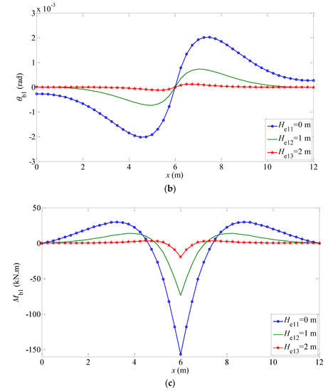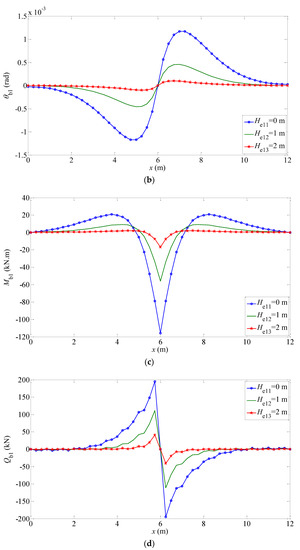 The mechanical behaviors of the elastic foundation beam under different working conditions are shown in Figure 5 and Figure 6. The displacement and rotation angle of the beams are given in Figure 5a,b and Figure 6a,b; the bending moment , shear force of beams, and subgrade force are given in Figure 5c–e and Figure 6c–e, respectively. Figure 5a and Figure 6a shows that the inhomogeneity of Gibson foundation soil has a great influence on the displacement of the elastic layer around the load, but a little influence on the far position of the elastic layer (). The displacement of the finite-length beam embedded in the Gibson elastic foundation is mainly affected by the rigidity of the surface soil, but less by the deep part of the foundation. Therefore, in order to reduce the displacement of the foundation in engineering, physical properties of the foundation at a certain depth can be improved, such as increasing its strength; but to strengthen the deep part of the foundation, its effect will be limited. Figure 5c,d and Figure 6c,d satisfy the boundary condition that the bending moment and shear force of both ends are zero.