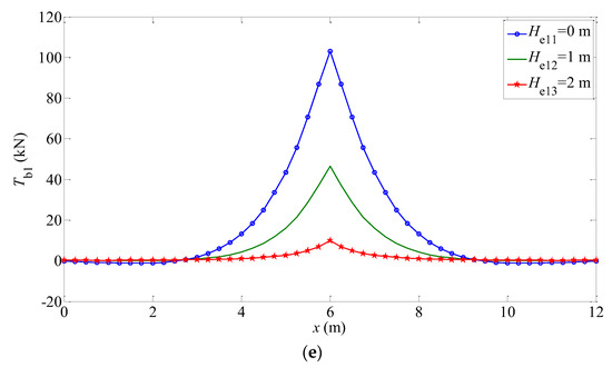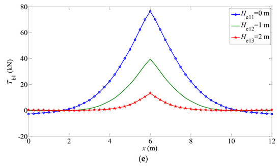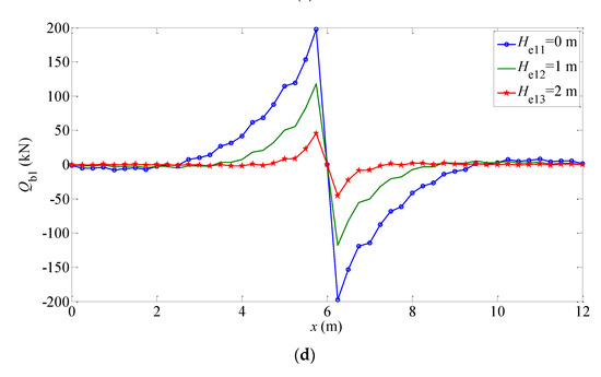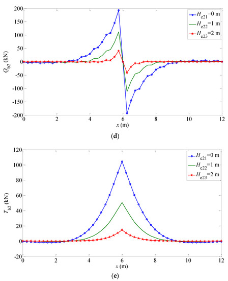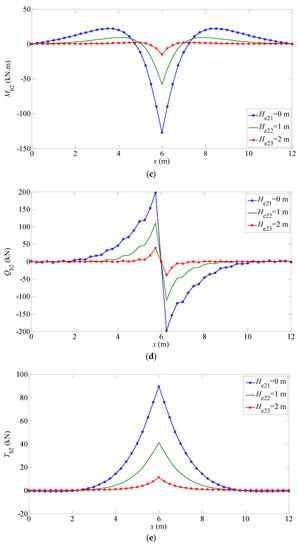 The mechanical responses (, , , , ) of the elastic foundation beam under different working conditions are shown in Figure 7 and Figure 8. The trend of these Figures is consistent with the reality. The bending moment and shear force meet the free boundary conditions at both ends as shown in Figure 7c,d and Figure 8c,d. It can be seen that when the modulus of elasticity in the normal direction of the isotropic plane increases, the displacement, rotation angle, and bending moment of the finite-length beam decreases, while the shear force is almost constant and the subgrade force increases. Moreover, for different transversely isotropic foundations, the greater the embedment depth of the beam, the smaller the mechanical response of the structure, such as the displacement, rotation angle, bending moment, and so on. The reasons are similar to the factors of the beam embedded in Gibson foundations, including the restraining effect of foundation soils on the beam structure and the decrease of the characteristic coefficient affecting the beam displacement.