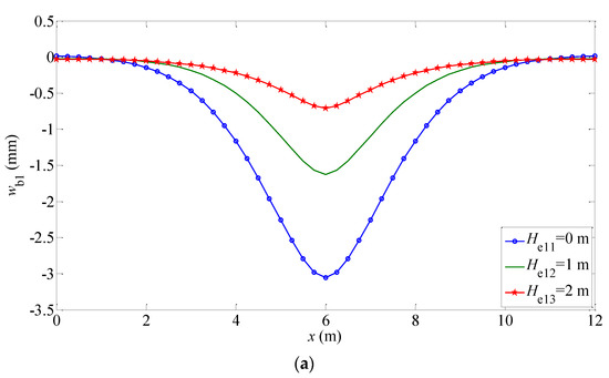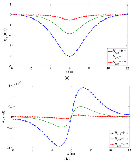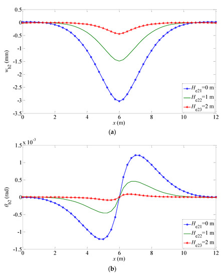 Furthermore, it can be seen from these figures that for different Gibson elastic foundations, the displacement, rotation angle, internal forces of the beam, and subgrade force decrease with the increase in the embedment depth. The main reasons are analyzed as follows: (1) the soil media near the beam have the characteristics of continuity and shear, which limits the settlement of the structure to some extent; (2) with the increase in the embedment depth, the characteristic coefficient related to the embedment depth decreases, resulting in the reduction of the vertical displacement of the beam structure.
