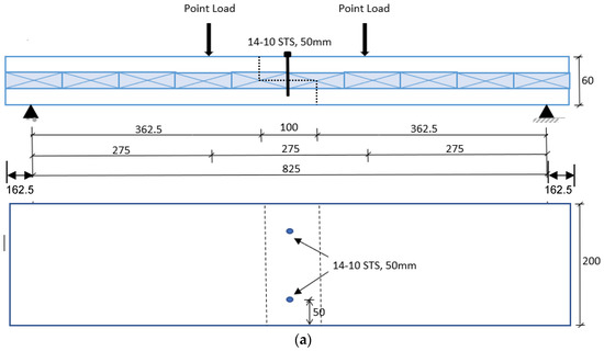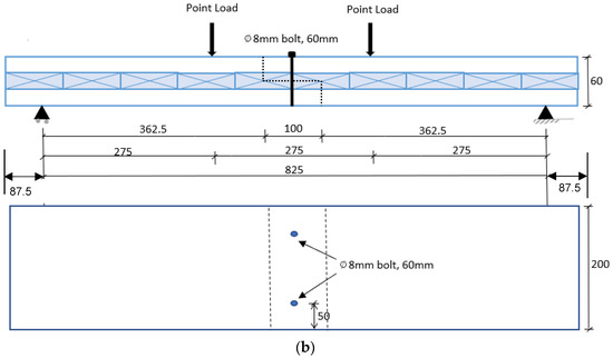 Three-ply CLT specimens, manufactured using Norway spruce (Picea abies) and supplied by Stora Enso, were used in this study. The lamella thickness of each ply was 20 mm, which resulted in a total thickness of 60 mm. Figure 1 shows a diagram of the four-point bending test set-up for the half-lap CLT connection. To examine the influence of fasteners on the lap connection, two separate sets of fasteners, such as self-tapping screws (STS) of Ø14 mm, and bolts of Ø8 mm with washers were used to prepare the connections. STS were inserted up to a depth of 50 mm into the CLT member, resulting in a 20 mm penetration into the lower lap, as shown in Figure 1a. STS was installed using a handheld drilling machine and the minimum edge distance was maintained following the AS 1720.1 [28].