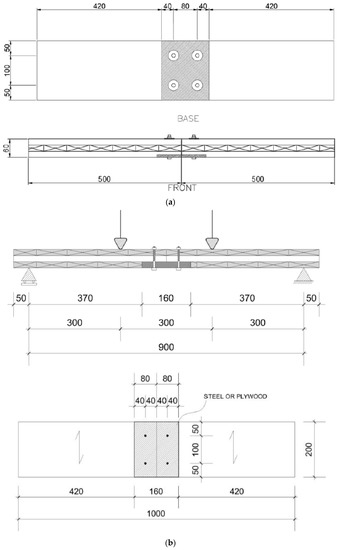 Figure 2 demonstrates a spline connection system used in the study. Splines were bolt-connected to the bottom face of the CLT specimens only. To make the single spline connections, three different types of splines, e.g., steel plates with a thickness of 3 and 8 mm, and plywood plates with a thickness of 17 mm, were selected. A total of 4 bolts were installed on each plate. The plywood plates were connected to CLT members in two ways: (i) with bolts only and (ii) glue plus bolts. Two separate bolt diameters (6 and 8 mm) were used to investigate the effect of bolt diameter on the performance of connections. Bolts were installed in the spline connection in the same manner as were for the lap connection.