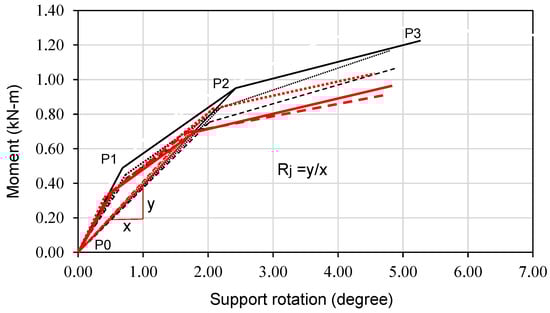 Rotational rigidity, denoted as Rj, is determined from the slope of the moment–rotation curves. To determine Rj, simplified moment–rotation curves were used. Trilinear curves were drawn on the moment–rotation curves, as shown in Figure 4. Points P0 to P1 are linked by the first linear curve, points P1 to P2 are connected by the second, and points P2 to P3 are joined by the third linear curve. The rotational rigidity of the connection of the CLT specimen is here defined by the slope of the line between points P0 and P2 [33]. The rotational ductility of the CLT connection was determined using Equation (3), as outlined in Eurocode 5.