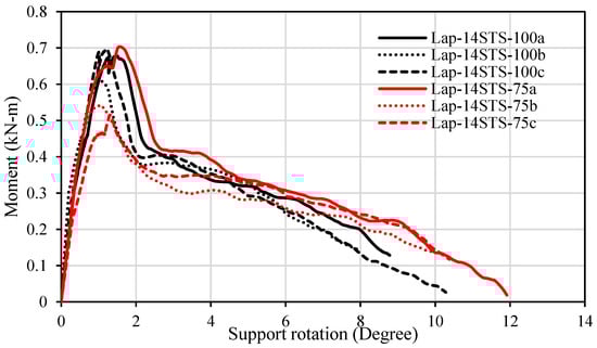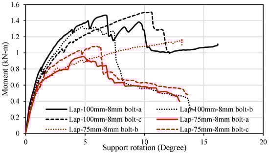 Figure 6 and Figure 7 present the moment vs. support rotation behaviors of bolted and screwed lap connections with different lap lengths, respectively. Based on the characteristic values of the moment capacity, the bolted and screwed lap connections with a 100 mm lap length showed 39% and 33% higher moment capacity than that with a 75 mm lap length, respectively. This implies that the half-lap connections with longer lap lengths, whether STS- or bolt-connected, may offer higher ultimate moment capacity than the connections with smaller lap lengths. Additionally, the improvement in the bolted connection for increased lap length was significantly higher than the same in the STS-based connection. Therefore, lap length is an important parameter that should be considered for bolt connection.