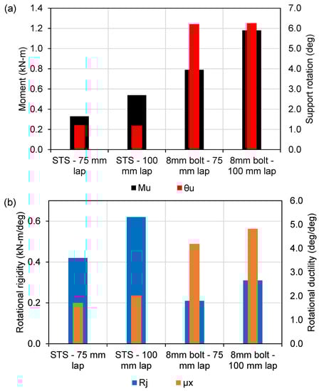 Figure 8a presents the characteristic ultimate moment and the corresponding characteristic support rotation values, and Figure 8b shows the characteristic rotational rigidity and ductility for various lap connections. The ultimate moment capacities of bolted lap connections with 100 and 75 mm lap lengths were about 2.18 and 2.40 times higher compared to their STS counterparts with 100 and 75 mm lap lengths, respectively. In the case of support rotation, this difference was even more significant. For bolted connections with 100 and 75 mm lap length, support rotations were approximately 5.35 and 5.13 times higher than those for STS connections, respectively. In contrast, the rotational rigidity of the STS connection was twice that of the bolted lap connections. Lower rotational rigidity and higher support rotation at the ultimate moment in bolted lap connections could be attributed to the use of washers. Using a washer increases the contact surface between the bolt head and the CLT panel, resulting in a reduction in bearing stress concentration. This eventually led to an increase in the ductility of the bolted lap connections, as the ductility of the bolted lap connection is found to be approximately 2.4 times higher than that of screwed lap connections.