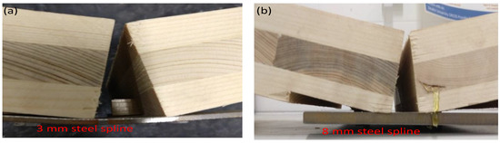 The failure modes of the splined connections with 3 and 8 mm thick steel plates are shown in Figure 9a,b, respectively. The 3 mm steel spline bent due to the applied load, but the CLT panels remained unaffected. An opposite scenario was observed for the 8 mm steel spline plate, in which the steel spline was intact, but CLT panels failed at the contact surface, as discussed in Section 3.1.
