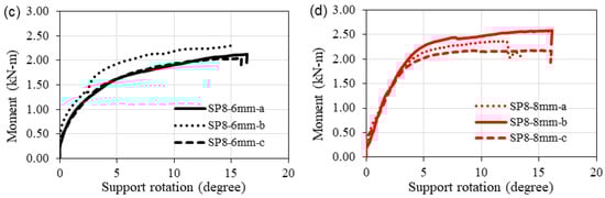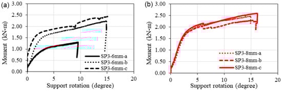 Figure 10 depicts the moment–rotation performance of the half-spline connection with different thicknesses of steel plates and bolt diameters. In general, all moment–rotation curves demonstrated a sharp increase in the moment capacity in the elastic zone, followed by a smooth plastic curve until it reached the ultimate moment capacity. Beyond that, a sudden drop in the curve was observed, indicating the failure of the connection. The Ø8 mm bolted connections showed higher ultimate moment capacity than the Ø6 mm bolted connections for both the 3 and 8 mm steel spline, which can be seen in Figure 10. Support rotations at the ultimate moment for most of the considered spline connections were consistently close to 150, except for SP3-6 mm-a (Figure 10a) and SP8-8 mm-a (Figure 10d), which showed support rotations of 9.55° and 12.03° at the ultimate moment, respectively.
