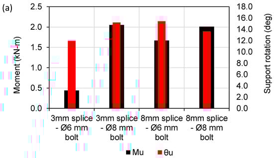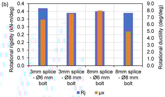 Figure 11a, b presents the characteristic values of the key performance indicators of the bolted steel spline connections. For the splined connections with 3 mm steel plates, the Ø8 mm bolted connections showed 4.6 and 1.27 times higher ultimate moment and support rotation than those of Ø6 mm bolted connections. For the splined connections with 8 mm-thick steel plates, the Ø8 mm bolted connections showed 1.20 times higher ultimate moment capacity but 11.3% lower support rotation than those of Ø6 mm bolted connections. The rotational rigidity of the Ø8 mm bolted splined connections is 8.10% lower compared to that of the Ø6 mm bolted splined connections with 3 mm-thick steel plates. However, for the splined connections with 8 mm-thick steel plates, the rotational rigidity of both Ø6 mm and Ø8 mm bolted connections were found to be the same. In summary, although the Ø6 mm bolted spline connections performed better than the Ø8 mm bolted spline connections in terms of rotational ductility, an increase in bolt diameter seemed to increase moment capacity.