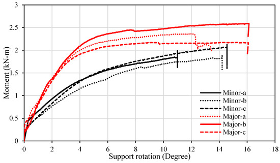 Figure 12 presents the moment–rotation curves of the bolted spline connections used for CLT specimens tested along the major and the minor axis. The specimens being oriented about the major axis means that the outermost CLT layers are running parallel to the length of the specimen, whereas being centered around the minor axis indicates that the outer layers are perpendicular to the length of the connection. The connections of CLT specimens tested along the major axis demonstrated higher capacity compared to those oriented about the minor axis. This is obvious, as CLT has a higher load-carrying capacity along the major axis. Nonetheless, the performance of the connection system around the minor axis is not insignificant, as the difference in the ultimate moment capacity and rotation was only 7% and 8%, respectively, as shown in Figure 13a. The noticeable difference in the moment–rotation behaviour of the spline connection along the major vs. minor axes was due to the short elastic zone in the case of the minor axis specimens.