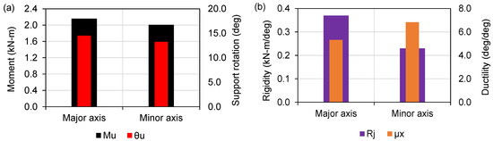 Figure 13b presents the rotational rigidity and ductility of the bolted spline connections tested along with the major and the minor axis. Numerically, the rotational rigidity for a major axis-oriented specimen is about 37% higher compared to a minor axis specimen. However, the opposite scenario was observed for rotational ductility; major axis-oriented specimens showed about 28% less ductility than minor axis-focused connections.