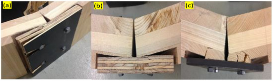 Failure modes of (a) glued and bolted plywood, (b) unglued and bolted plywood and (c) 8mm-thick steel spline connection.