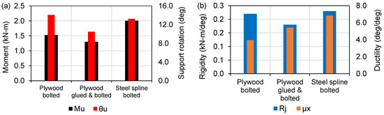 Comparison among (a) bending moment and support rotation, (b) rotational rigidity and rotational ductility of steel spline connections with variation in steel plate thickness and bolt diameter.