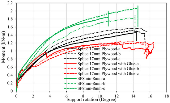 While comparing the effect of the spline plate, it is evident that the unglued plywood plate was more flexible, leading to higher ultimate moment capacity. The steel plate increased the ultimate moment capacity but reduced the flexibility (support rotation) to some extent. Overall, compared to the lap connection, the spline connection exhibited higher moment capacity and experienced greater support rotation.