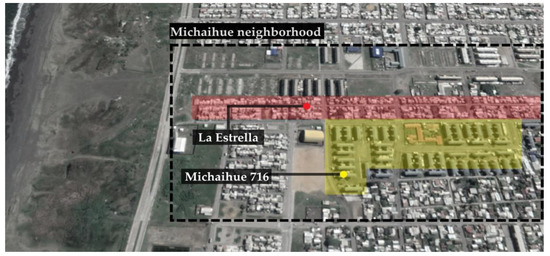 The area’s climate is Mediterranean, with an annual average temperature of 12.7 °C, and a minimum of 1 °C in winter. The relative humidity average is 84.2%, with a maximum of 95.1% (April) and minimum of 55.3% (January). The choice of the case study was made intentionally, with the goal of including in the sample, dwellings that would foreseeably have EP-associated issues. For this reason, the dwellings included in the “Study: improvement of the urban and living conditions of the Michaihue Housing Complex, San Pedro de la Paz” were chosen. The Chilean Ministry of Housing and Urbanism (MINVIU) identified, in this complex, problems associated to excessive density, insufficient size, construction flaws, and social problems, along with a high concentration of poverty [23]. Consequently, the case study focuses on two Housing Complexes, Michaihue 716, built in 1999, comprising 45, 4-floor blocks (716 dwellings), and the La Estrella Complex, that comprises 274 houses built in the same period (See Figure 1).