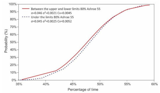 EAQES D3, on climate control of the dwelling, comprises six indicators, while EPTTI only uses three (D3-I2, D3-I3 and D3-I4). D3-I1 (Indoor temperature) and D3-I6 (Indoor Humidity) establish the deprivation threshold associated to the number of hours (percentage) the home is within the limits defined in the ECSV, which depends on the thermal zone the dwelling is located in. Indoor temperature limits can range between 30% and 70% of the occupation time (for the study area, it is 40%), with a comfort temperature range between 19 °C and 26 °C for the threshold of D3-I1, and between 30% and 70% of relative humidity for the threshold of D3-I6, being able to use heating systems. When there is no information on the dwelling’s indoor temperature, it is possible to use D3-I2 instead, a subjective indicator where the home states being cold or hot during winter or summer months. Data collection onsite and energy simulations have allowed showing that, despite low construction quality, indoor temperatures are often within thermal comfort ranges more than 40% of annual hours (Appendix B), with an 87% probability of these being in a discomfort situation (see Figure 3). However, it must also be highlighted that in cold periods, there is a relevant percentage of hours (48% on average) whose probability of being below thermal comfort limits for more than 40% of annual hours is 95%. However, other research projects made in this type of social housing and climate have shown that people are comfortable at much lower indoor temperatures, even 14 °C [28,36].