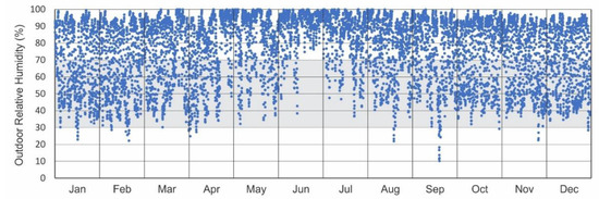 Regarding D3-I6 (Indoor Humidity), the results obtained show that outdoor relative humidity is above the limits, 65.9% of the year (see Figure 4) which, added to the low heating intensity in this type of dwelling [29] and other activities (drying clothing, cooking, electric kettles and occupation), generate high indoor humidity rates during winter. Because of this, and bearing in mind that 58.3% of homes have stated having mold in bedrooms and other rooms, 51.3% water leaks, 30.1% leaks in windows, 20.3% problems due to flooding, 40.7% presence of mold on north-facing walls, and 31.4% on south-facing walls, it is considered to not include this indicator and instead the adapted D3-I6, which can improve the sensitivity and soundness of the overall indicator, associating this indicator to moisture resulting from leaks and condensation, that favor the presence of mold.