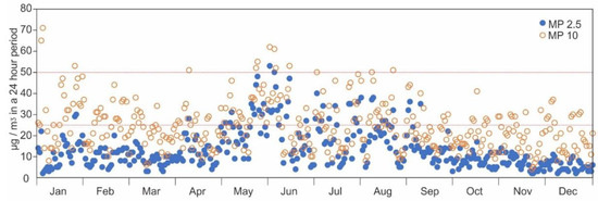 Particulate matter concentrations, PM2.5 and PM10 in 24-h periods measured during 2020 (author’s own preparation from [30]).