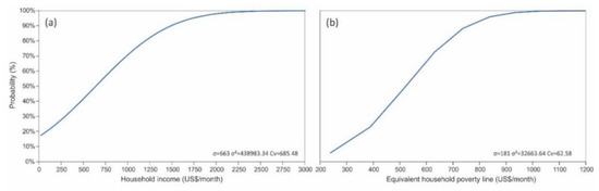Accumulated distribution of household income (a) and equivalent household poverty line (b).