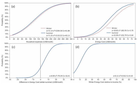 As for expenditure, bearing in mind rental or mortgage payments, administration fees, and consumption in electricity, gas, water, and Internet or telephone, it can be seen that both in winter and summer, there is a 50% probability that families spend over US$120 in summer and US$127 in winter (see Figure 7). Regarding consumption in electricity and gas, the consumption levels do not show great differences, with the probability of consuming more than US$38.8 in summer being 75%, and 80% in winter. It is important to highlight that, although consumption levels are not high, their relationship compared to the household income represents an important percentage, over 10% in 57.5% of the households in winter. Meanwhile, it is necessary to indicate that not all households increase their expenditure on electricity and gas in winter, 30% either maintain or reduce them, which indicates that perhaps other expenditures associated to other energies (i.e., firewood), which have not been collected due to their difficult quantification, are generated.