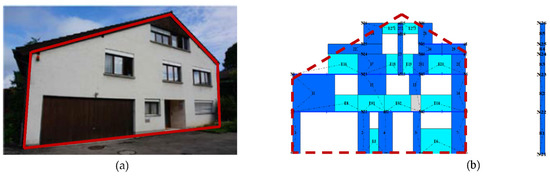 Three retrofitting alternatives have been designed for the synergetic seismic and energy retrofitting of the building, comprising 10 cm × 10 cm timber beams (Figure 6c) and two different bio-based materials for the thermal insulation of the vertical envelope of the building: cork and natural grass. The two different timber beam configurations that are designed to prevent the seismic out-of-plane failure of the critical south-east URM facade of the building (Figure 1b) and the corresponding numerical models using the research version of the software TreMuri [49,50,51,52] are shown in Figure 5. The timber beams have been modelled using elastic beam (flexural) elements (marked in red in Figure 5).