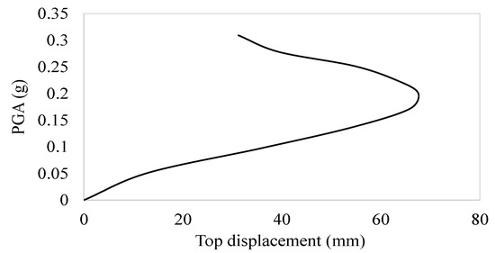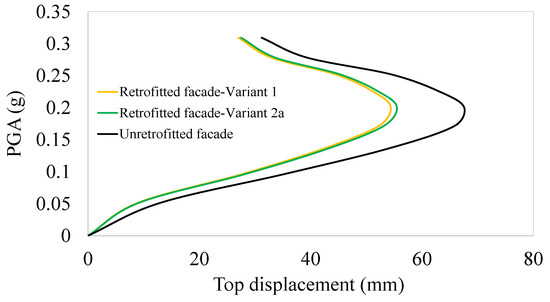 The determination of the out-of-plane deformation of the top of the retrofitted facade for a wide range of seismic intensity levels was performed using Incremental Dynamic Analysis (IDA), as presented by Vamvatsikos and Cornell [53]. The numerical model presented above was subjected to the ground motion ensemble comprising eight ground motion excitations, which was presented in Table 2. The mean IDA curve of the retrofitted facade out of plane and its comparison with the IDA curve of the unretrofitted facade (Variants 1 and 2a) are presented in Figure 7.