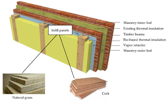 The first two retrofit alternatives shown above (Variant 1, Variant 2a) entail the use of 17.5 cm-thick recycled waste natural grass panels [63] (Figure 4) as thermal insulation for the energy upgrade of the building. A third retrofitting alternative (Variant 2b), which comprises the timber beam configuration of Variant 2a but a different thermal insulation material, is explored: this alternative consists of 17.5 cm-thick cork panels (Figure 4) as thermal insulation for the energy upgrade of the building. The design of the proposed preassembled panels and their connection with the timber beams is shown in Figure 6.