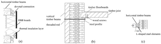 As presented in Figure 6, the seismic and energy retrofitting strategy comprises horizontal and vertical timber beams, which are fixed to the masonry facade and the floors of the building through L-shaped steel elements [66] and threaded steel tie rods (Figure 6b,c). The boundary conditions indicating the points of the connection of the proposed retrofit with the floors of the building are shown in Figure 5. The 17.5 cm-thick bio-based thermal insulation layers are attached to OSB (Oriented Strand Board) panels, which are connected with the 10-cm thick horizontal timber beams through dovetail joints (Figure 6a). This modular configuration comprising the preassembled panels with the OSBs and the thermal insulation layers, which are connected in situ with the horizontal timber beams through dovetail joints, facilitates the efficient installation of the proposed retrofitting design on the outer facade of existing masonry buildings.