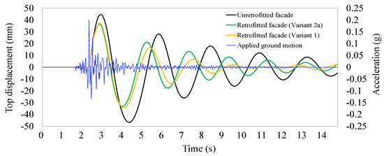 As shown in Figure 7 and Figure 8, both variants of the retrofitted facade manifested substantially smaller peak out-of-plane displacement than the unretrofitted facade, thus demonstrating the efficiency of the presented retrofitting strategy in reducing the out-of-plane displacement of the facade wall. The reduction in this out-of-plane displacement of the top of the facade wall is higher for Variant 1 (22% reduction compared to 20% obtained by Variant 2a, as shown in Figure 7) due to the higher amount of vertical timber beams that are attached to the facade in this structural configuration compared to Variant 2a.