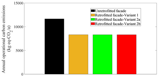 The heating demand of the building before and after the retrofitting was calculated using the energy assessment software Ubaqus [57] and is presented in Figure 9. The annual equivalent carbon emissions C due to the operation of the unretrofitted building are 11,654 kg CO2-eq/a. The application of the synergetic retrofitting variants 1 and 2a, which are based on the same thermal insulation material (recycled natural grass) on the vertical envelope of the building led to the same value of the operational carbon emissions of the building, corresponding to 8316 kg CO2-eq/a and 28.6% reduction compared to the unretrofitted building. The use of cork as a thermal insulation layer applied for the retrofitting variant 2b led to the same value of the operational carbon emissions of the building due to the same thermal conductivity (U-value) of cork (0.040 W/mK) with the corresponding value of the recycled natural grass.