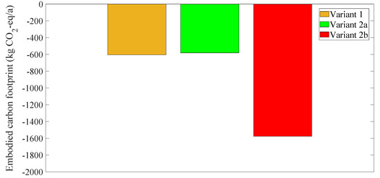 The embodied carbon emissions of the materials that are chosen for the implementation of the synergetic retrofitting strategies shown in this study are presented in Figure 10. As shown in the figure, the use of the bio-based materials presented in this study leads to negative carbon emission values for all the retrofitting variants, thus demonstrating the sustainability of the synergetic retrofitting solutions comprising timber and bio-based thermal insulation panels. However, the retrofitting variant 2b, comprising the use of timber beams and cork insulation panels, manifests substantially lower (negative) embodied carbon emission values compared to the other two variants, which correspond to the maximum storage of CO2 by the materials and the lowest environmental impact among the three retrofitting solutions. This beneficial behavior of variant 2b is attributed to the ability of cork to store large amounts of CO2 during its use, thus contributing to the reduction in carbon emissions in the atmosphere and the mitigation of the consequences of climate change.