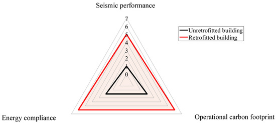 The improvement of the seismic and energy performance of the building compared to the unretrofitted building and the environmental advantages due to the use of low-carbon retrofitting methods are integrated and visualized in a novel assessment framework that can be used for the holistic evaluation of the seismic behavior, the energy performance and the carbon footprint of existing buildings, defined as the Seismic and Energy Retrofitting Scoreboard (SERS). This framework proposes the use of a rating system that utilizes performance metrics and awards points (0–7) for the performance of the building in four different aspects: the seismic behavior of the building, the heating demand of the building (related to its operational carbon emissions), the embodied carbon emissions and the cost of retrofitting. A dimensionless factor, defined as energy compliance, is used to compare the energy performance of the building with the energy performance of a new building with the same dimensions, designed in the same location. The results of the rating are visualized using a spider-web-shaped diagram with four axes. Within this frame, the optimal retrofitting solution among the assessed variants can be illustrated through the maximization of the inner area of the trapezoidal curve that corresponds to the rating of the retrofitting of the building. The retrofit variant comprising the installation of timber beams and cork thermal insulation panels at the vertical envelope of the building (Variant 2b) leads to the maximum rating of 7 regarding the aspect ‘Embodied carbon footprint’ and the maximum inner area in the Figure, while the two other retrofit variants (1, 2a) lead to a lower rating in this aspect, equal to 5. The rating of all retrofit variants presented in this study considering the other performance aspects (seismic performance, energy compliance, cost) using the SERS framework is the same.