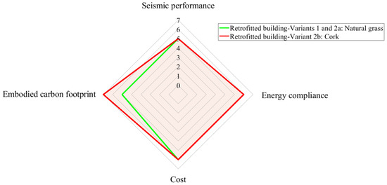The values that indicate the relative closeness of each retrofit variant to the fictitious ‘ideal’ retrofit solution are shown in Table 7 in preferential order (I corresponds to the optimal solution among the assessed options, III corresponds to the least optimal solution among the assessed options). The relative closeness values lie in the range (0, 1), with a value of 1 indicating that an alternative is the ‘ideal’ solution. The difference between the relative closeness values can be used to quantify the preference of one alternative over the other alternative [23,71]. As shown in Table 7, the retrofit variant 2b is the optimal retrofit solution among the assessed variants, due to the ability of cork to store the highest amount of CO2 manifested by the negative carbon footprint of the material (Table 4). The retrofit variant 2a yields slightly better results than variant 1 due to the attractively minimal use of timber in the facade for the improvement of the seismic out-of-plane behavior of the building, which leads to similar reduction in out-of-plane displacement with variant 1. These results are in agreement with the results obtained through the maximization of the area obtained through the Seismic and Energy Retrofitting Scoreboard (SERS) shown in Figure 12, which also demonstrates the attractive characteristics of retrofit variant 2b as the optimal retrofit solution among the assessed variants.