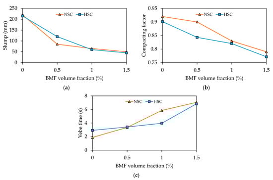 - The addition of BMF reduced the concrete workability. Normal- and high-strength concrete mixtures having a similar initial slump exhibited a similar degradation in the workability due to the addition of BMF. At νf of 1.5%, the concrete workability category dropped from high/medium to low/very low.