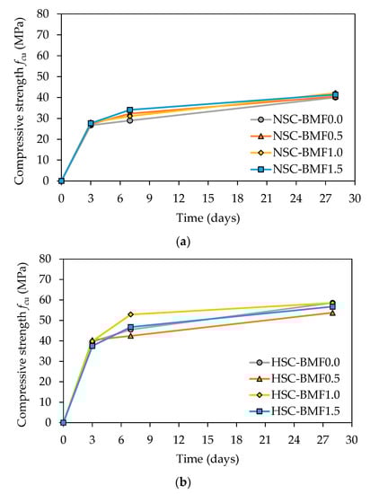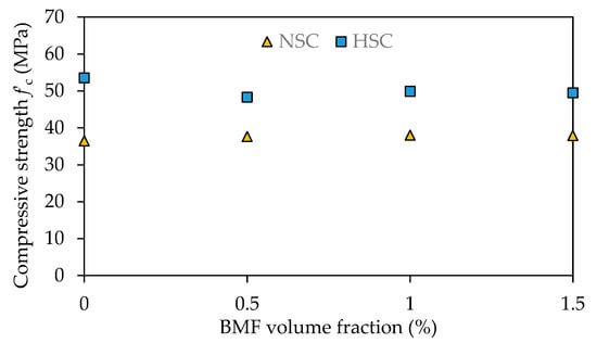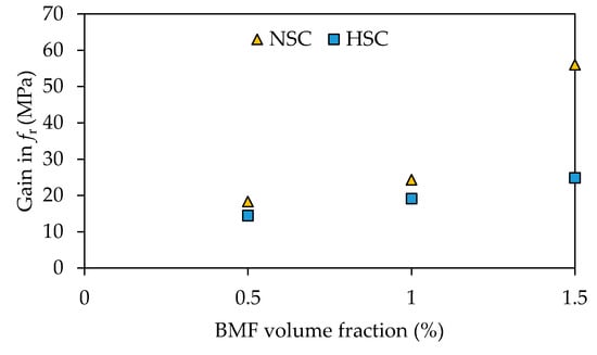 - The addition of BMF to NSC at νf of 0.5 and 1.0% increased the flexural strength by 18 and 24%, respectively, whereas a significant strength gain of 56% was recorded at the higher νf of 1.5%. The flexural strength of the HSC was improved by the addition of BMF but to a lesser extent, where flexural strength gains of 14, 19, and 25% were recorded at νf of 0.5, 1.0, and 1.5%, respectively.