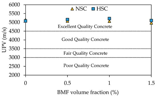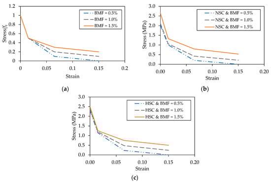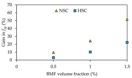 - The improvement in the tensile properties caused by the addition of BMF was more significant for the NSC rather than the HSC. Splitting tensile strength gains of 10, 24, and 52% were recorded for the NSC mixtures at νf of 0.5, 1.0, and 1.5, respectively. Their HSC counterparts exhibited respective splitting tensile strength gains of 3, 10, and 22%.